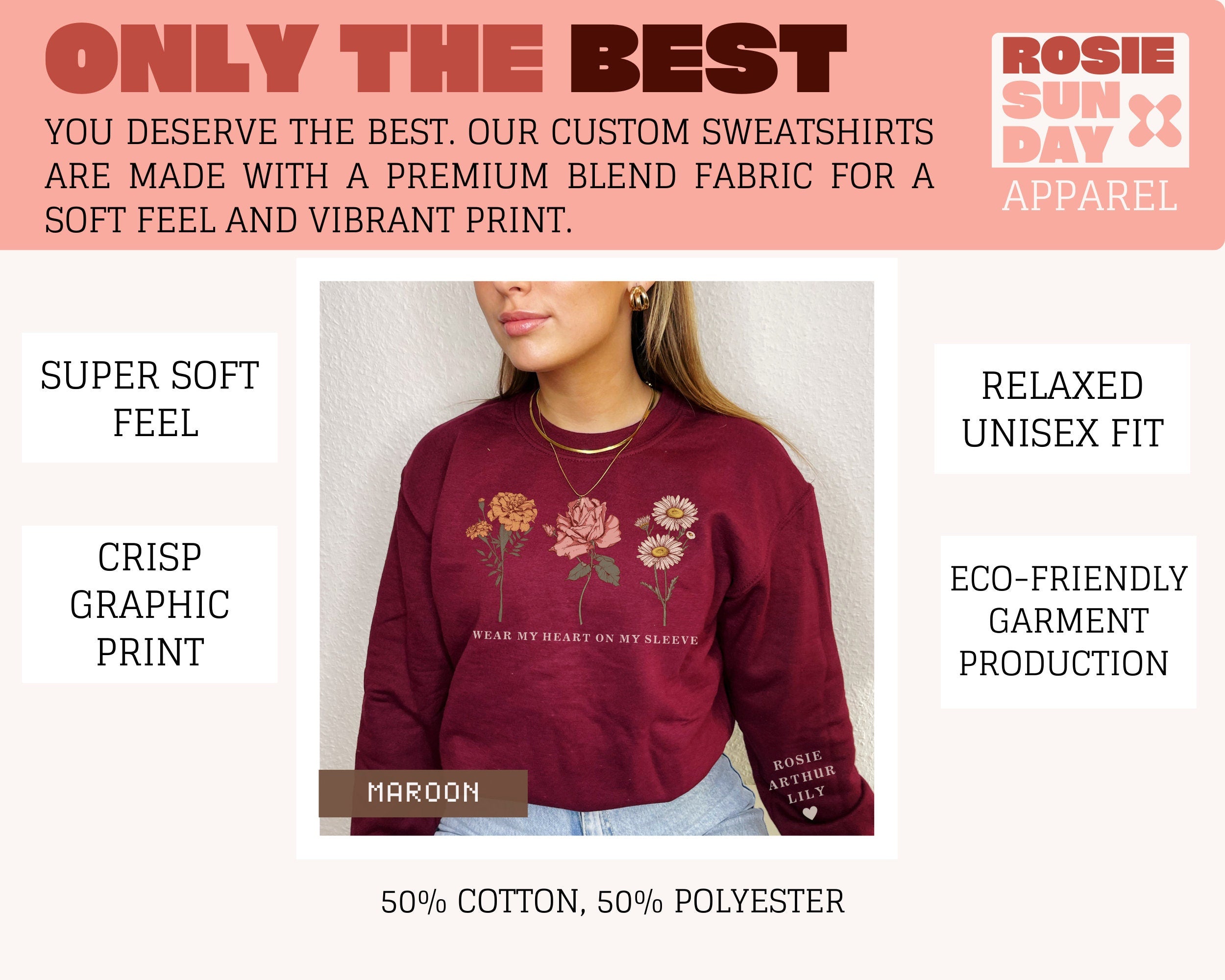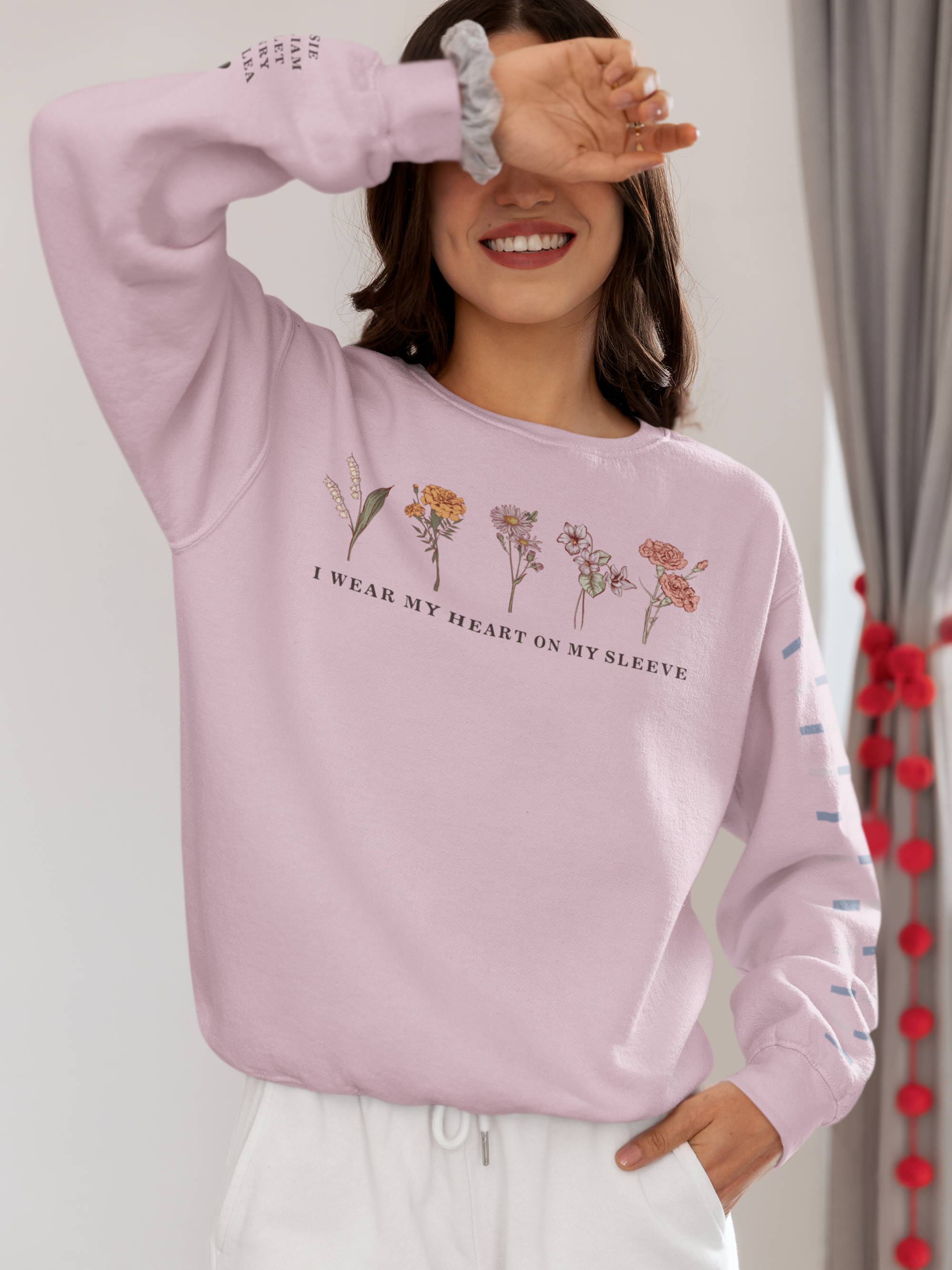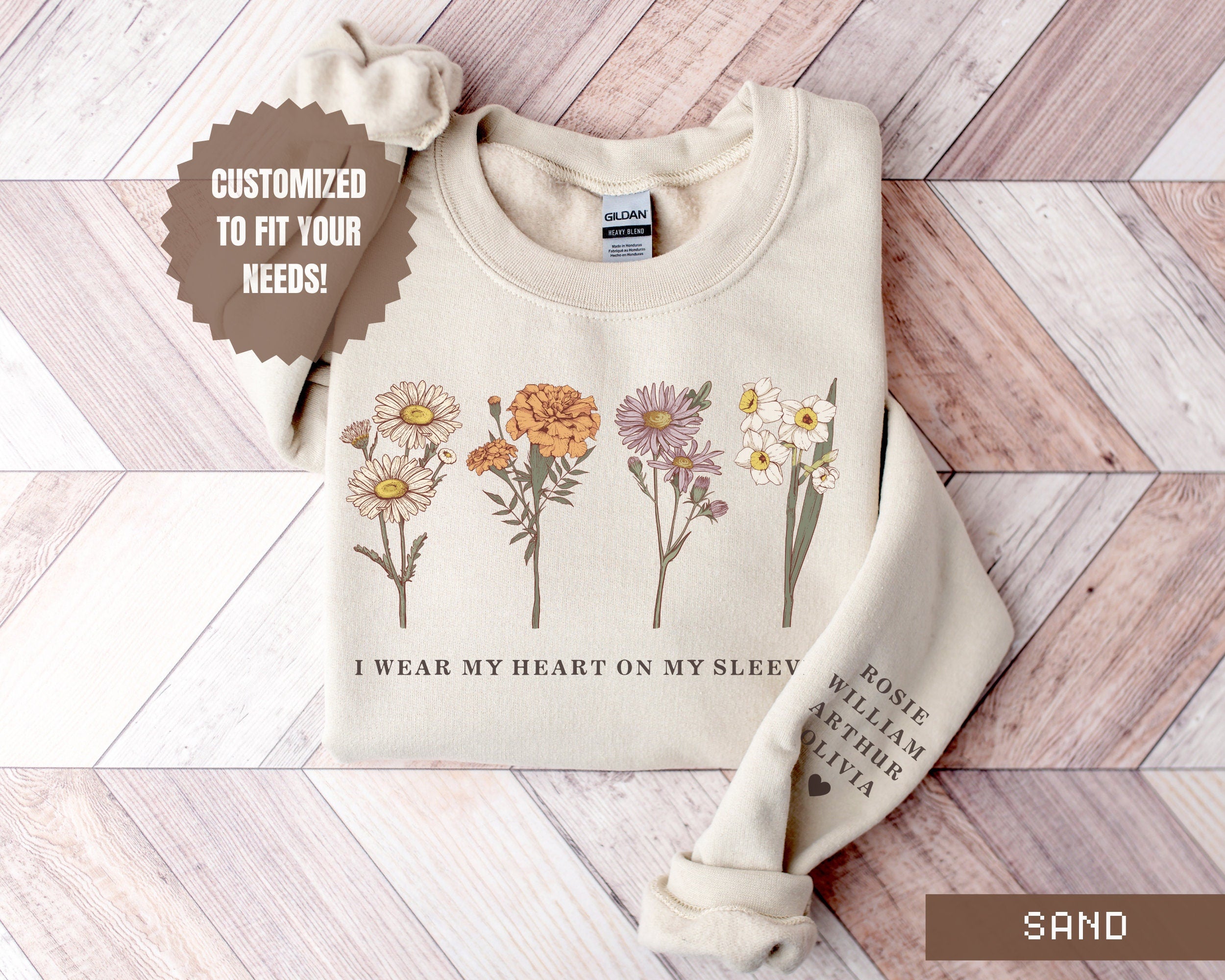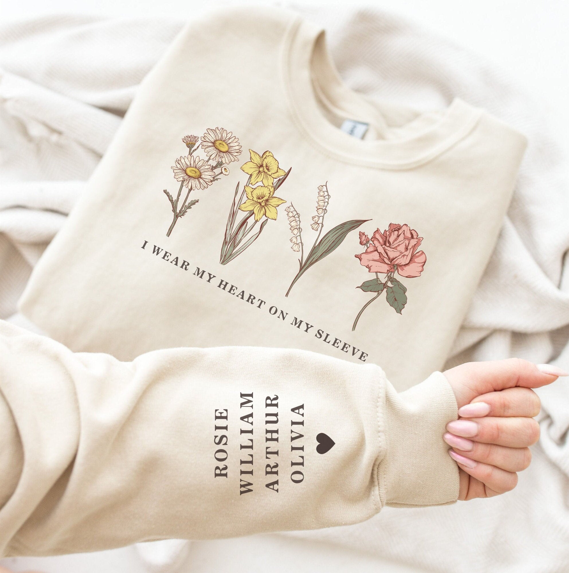 This beautiful I Wear My Heart On My Sleeve custom birth month flower sweatshirt is the perfect gift for any mama, grandma, or aunty so she can show off her babies!