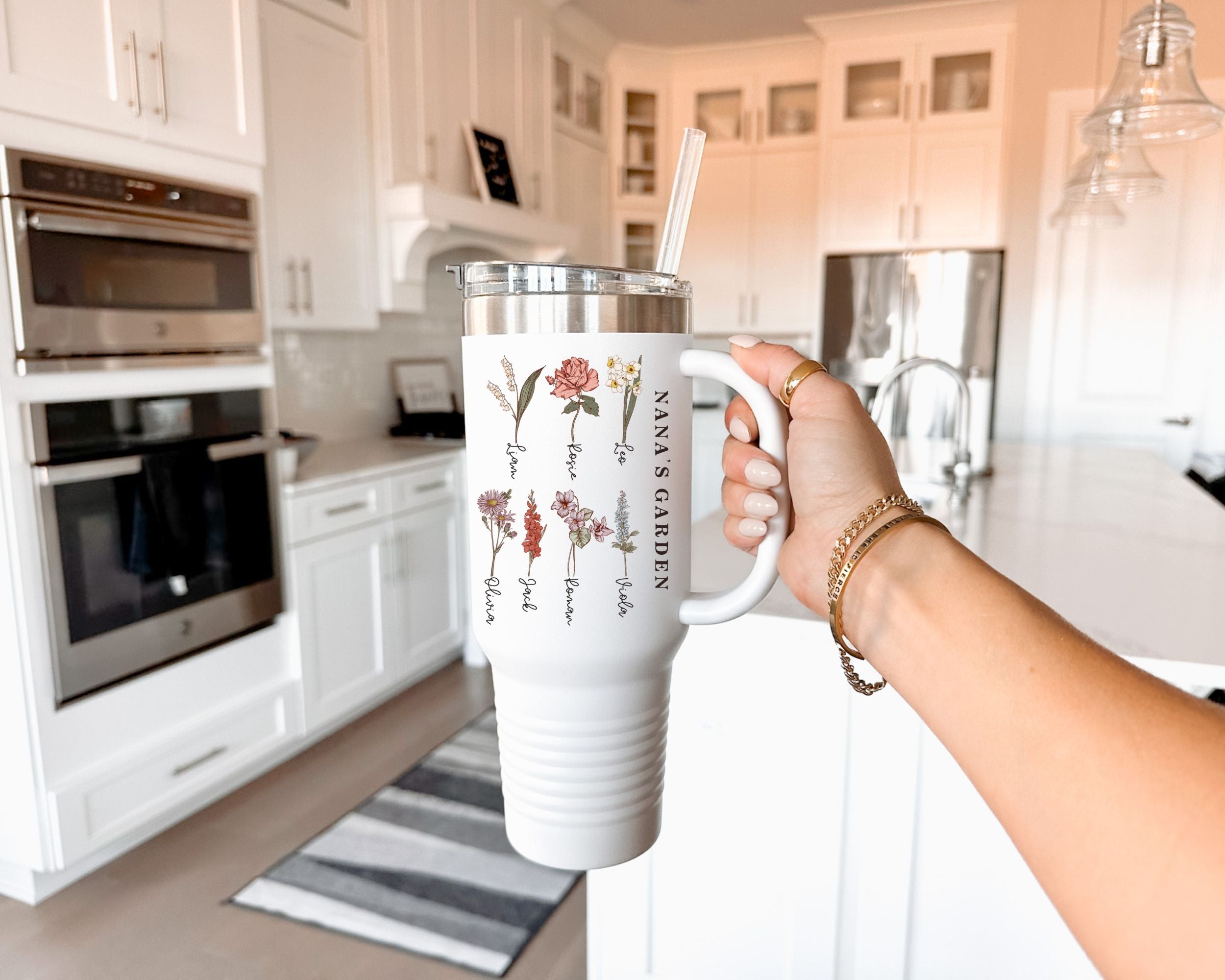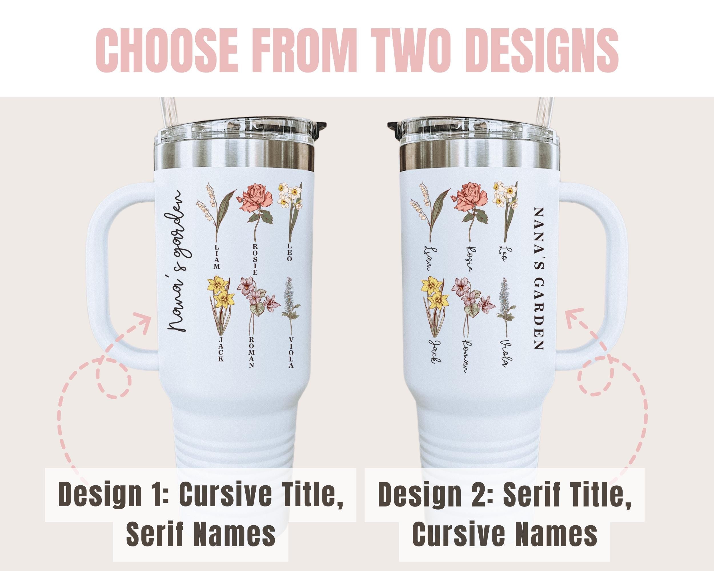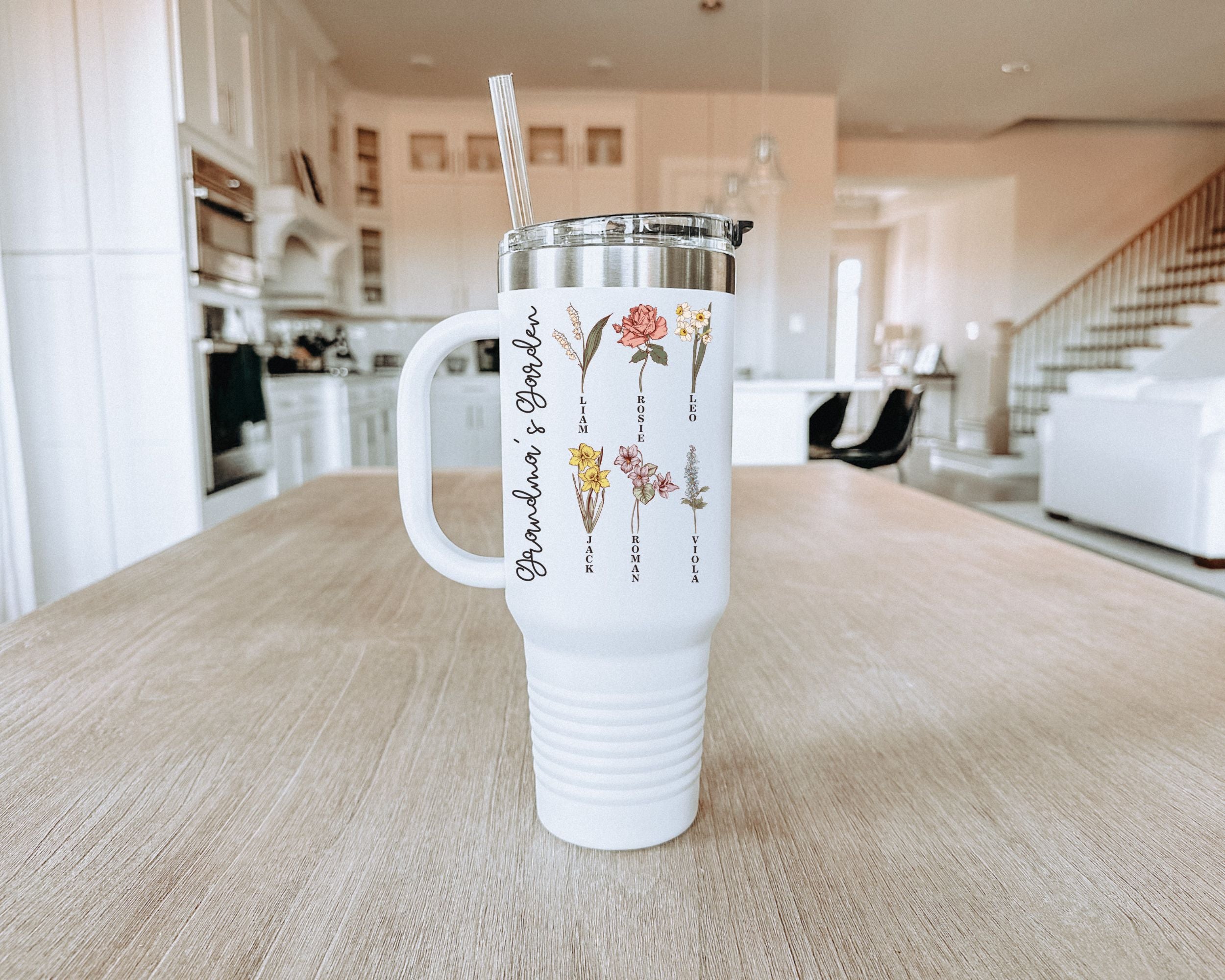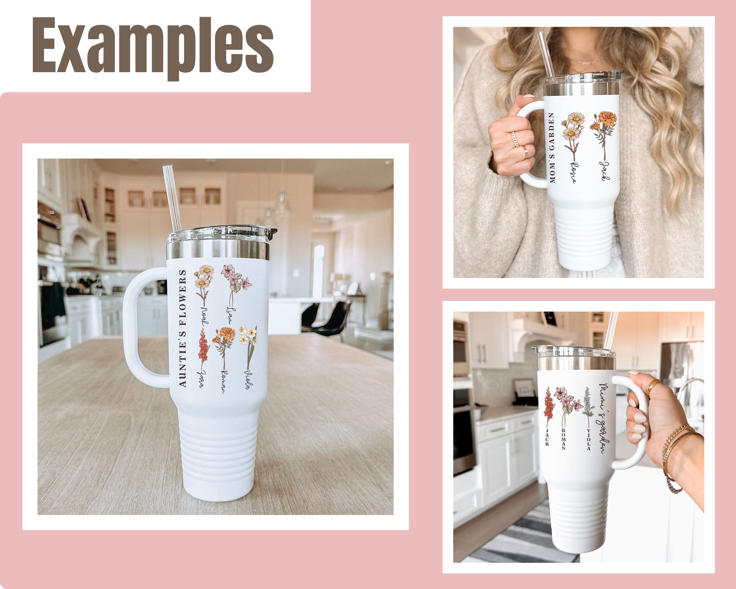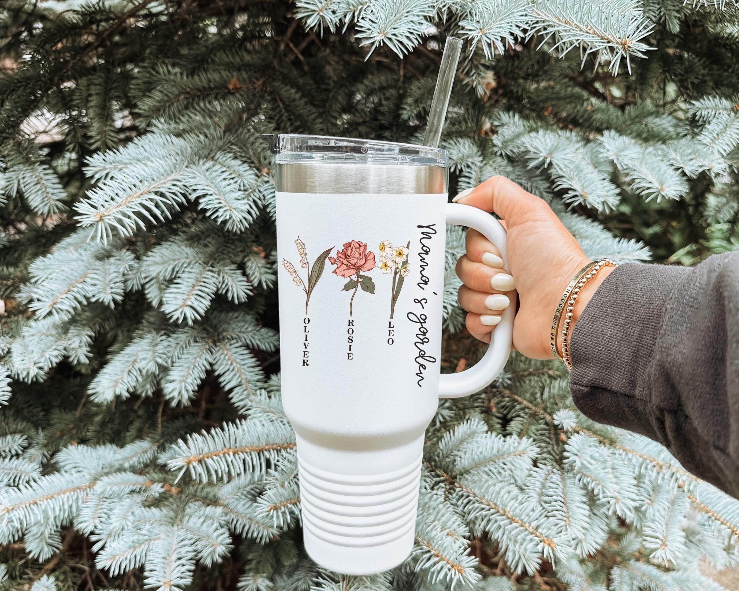 This beautiful CUSTOM birth month flower 40oz insulated tumbler is the perfect gift for any mom, Grandma, Nana, Gigi, Mimi, Aunty/Auntie, sister, etc. on her birthday, mother's day, grandparent's day, or for Christmas! Designed for adventurers and busy individuals, this tumbler perfect for both outdoor escapades and everyday routines. Enjoy your favorite beverages, hot or cold, wherever life takes you!
