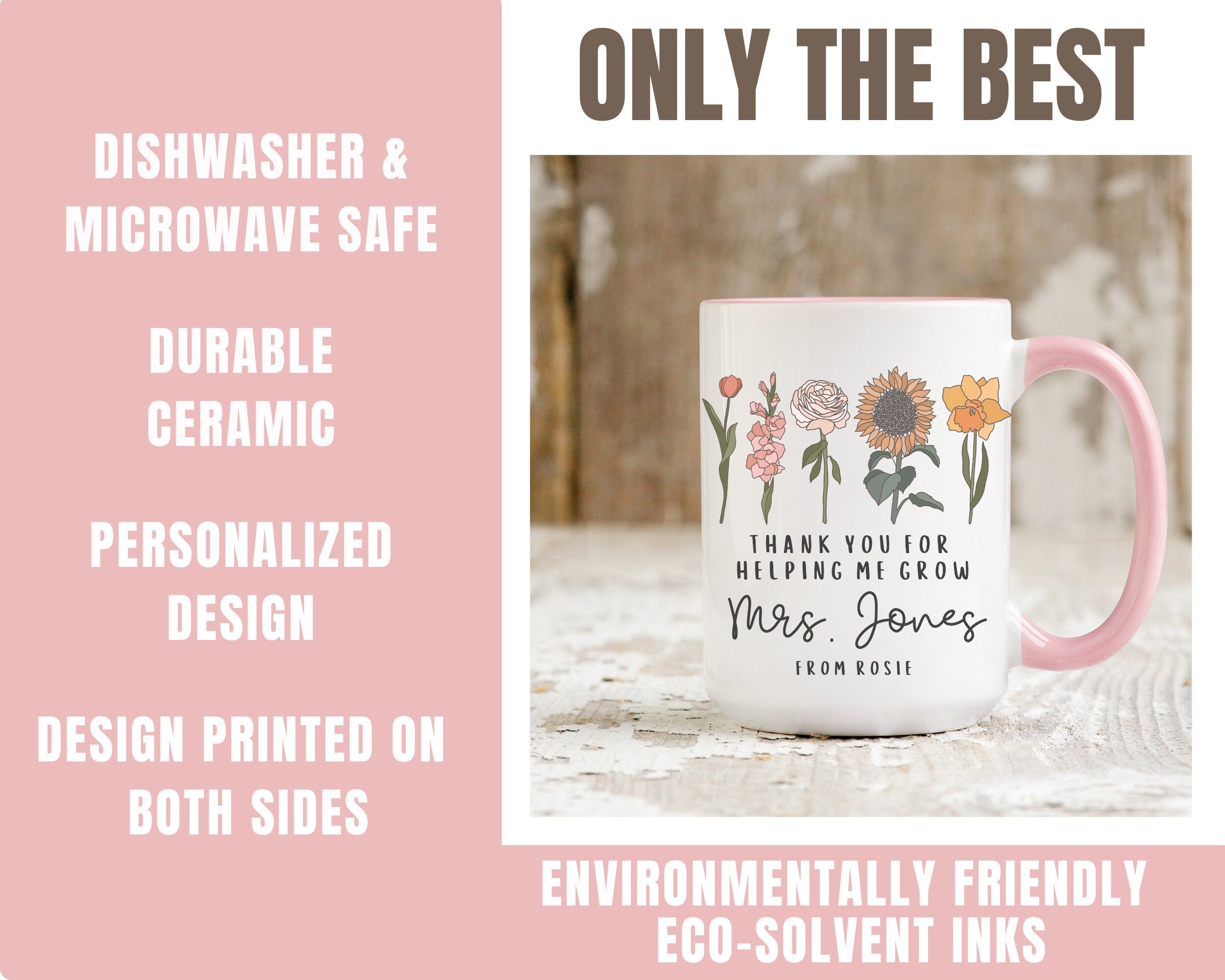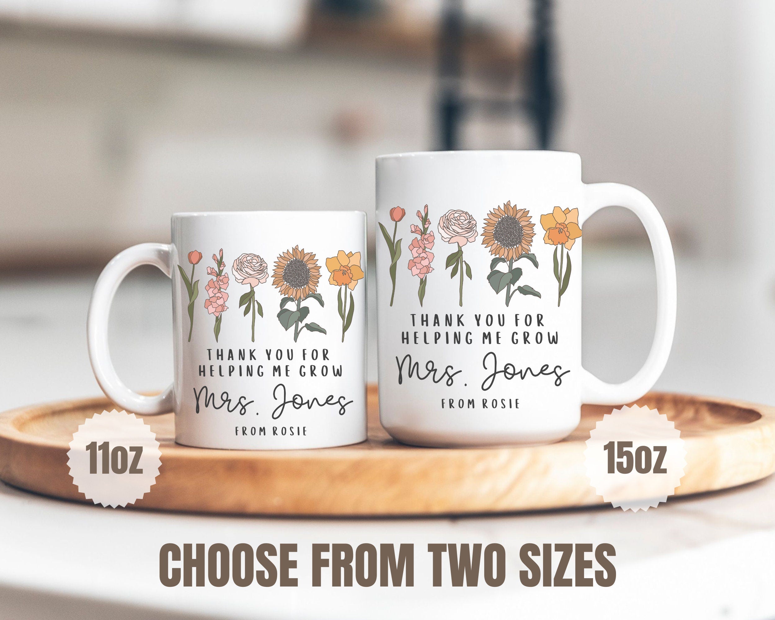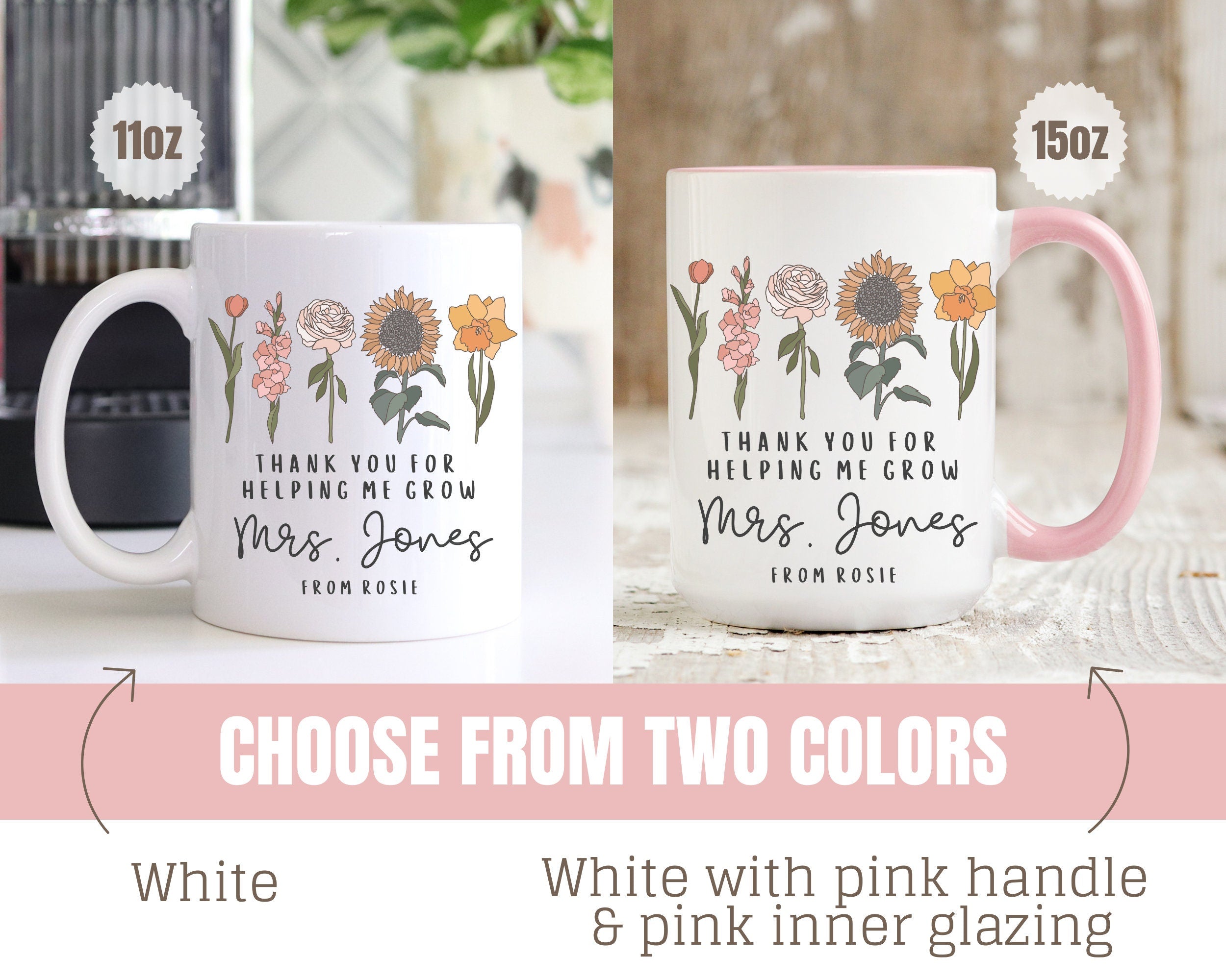 Are you looking for the perfect personalized gift for that special teacher in your life? This Thank You for Helping Me Grow CUSTOM mug makes the perfect gift for a preschool/nursery teacher, daycare teacher, elementary school teacher, early childhood educator!